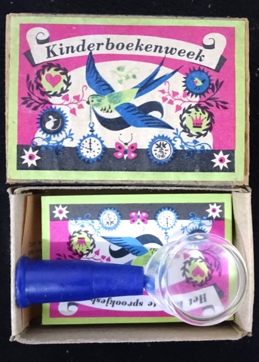 Miniboekje met blauwe loep - verpakt in een luciferdoosje (lijkt op het logo van Zwaluw Lucifers)