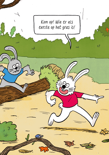 Twee nieuwsgierige konijnen vinden trommelstokken in het bos. Maar... waar is de trommel? Zo begint een vrolijke speurtocht door het bos!