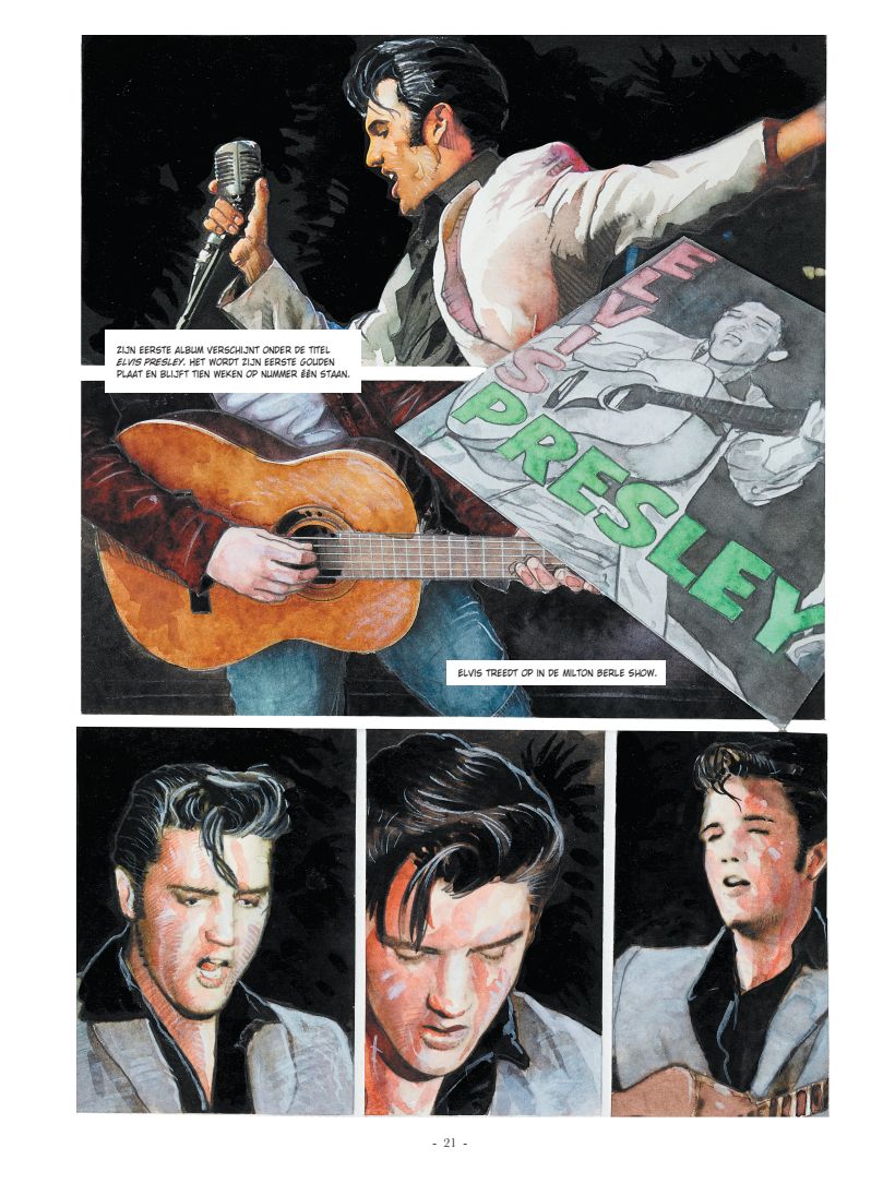Dit stripboek vertelt het verhaal van een jonge jongen die van niets komt en de grootste ster ter wereld wordt. Tot op de dag van vandaag is iedereen die zichzelf rock’n’roll-muzikant noemt hem iets verschuldigd. Elvis’ legende zal nooit sterven.
