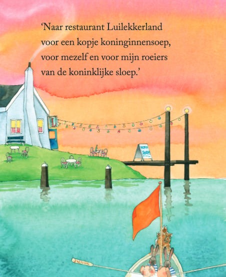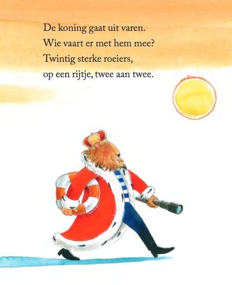 De koning gaat uit varen. Wie gaat er met hem mee? Twintig sterke roeiers, op een rijtje, twee aan twee. Daar zijn de eerste roeiers, de tweeling Snuf en Snuit. Snuf geeft Snuit een handje op de loopplank naar de schuit.