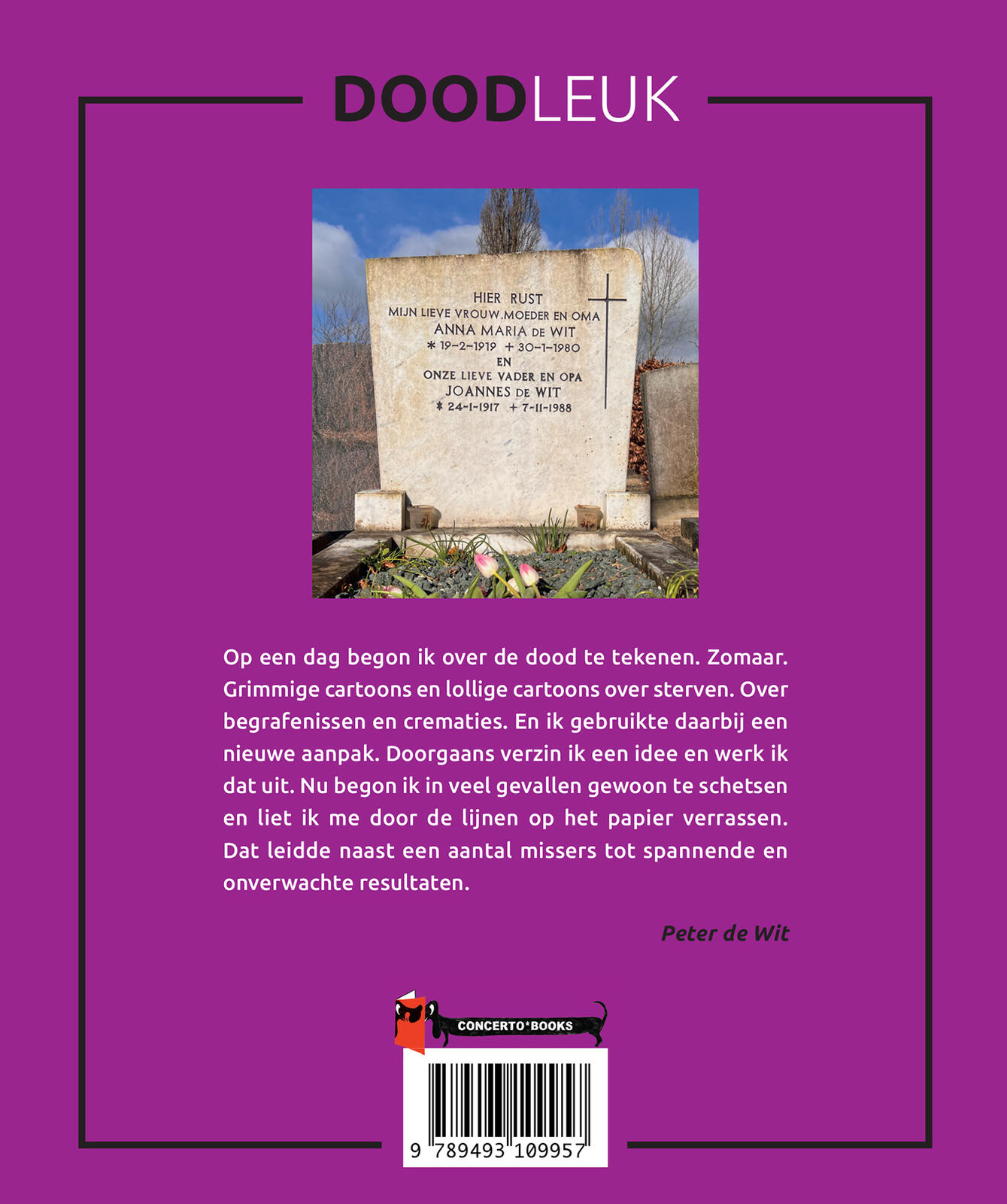 "De een zijn dood de ander zijn brood. Deze bekende uitdrukking gaat zeker voor mij op. Al meer dan vijfentwintig jaar maak ik cartoons voor Relevant, het tijdschrift van de Nederlandse Vereniging voor Vrijwillige Euthanasie. En mijn stripfiguur Sigmund uit de Volkskrant is zo begaan met zijn patiënten dat hij ze met enige regelmaat uit hun lijden verlost. We praten liever niet over de dood. Het is niet populair onder de mensen. Hoewel ieder van ons weet dat dit aardse leven eindig is, blijven velen van ons tot het allerlaatste moment koppig in de ontkenningsfase hangen. Door fanatiek te sporten en vitaminepreparaten te slikken, door cosmetische chirurgie en nieuwe heupen en knieën te laten plaatsen, zijn we vastbesloten het onvermijdelijke te vermijden. Maar van uitstel komt in dit geval geen afstel. We gaan er aan. Allemaal. Op een dag begon ik over de dood te tekenen. Zomaar. Grimmige cartoons en lollige cartoons over sterven. Over begrafenissen en crematies. Bij doodgaan horen emoties. Niet zelden heftig en ongecontroleerd. Een prima onderwerp voor een cartoonist dus. En ik gebruikte daarbij een nieuwe aanpak. Doorgaans verzin ik een idee en werk ik dat uit. Nu begon ik in veel gevallen gewoon te schetsen en liet ik me door de lijnen op het papier verrassen. Dat leidde naast een aantal missers tot spannende en onverwachte resultaten. Veel plezier met de dood."