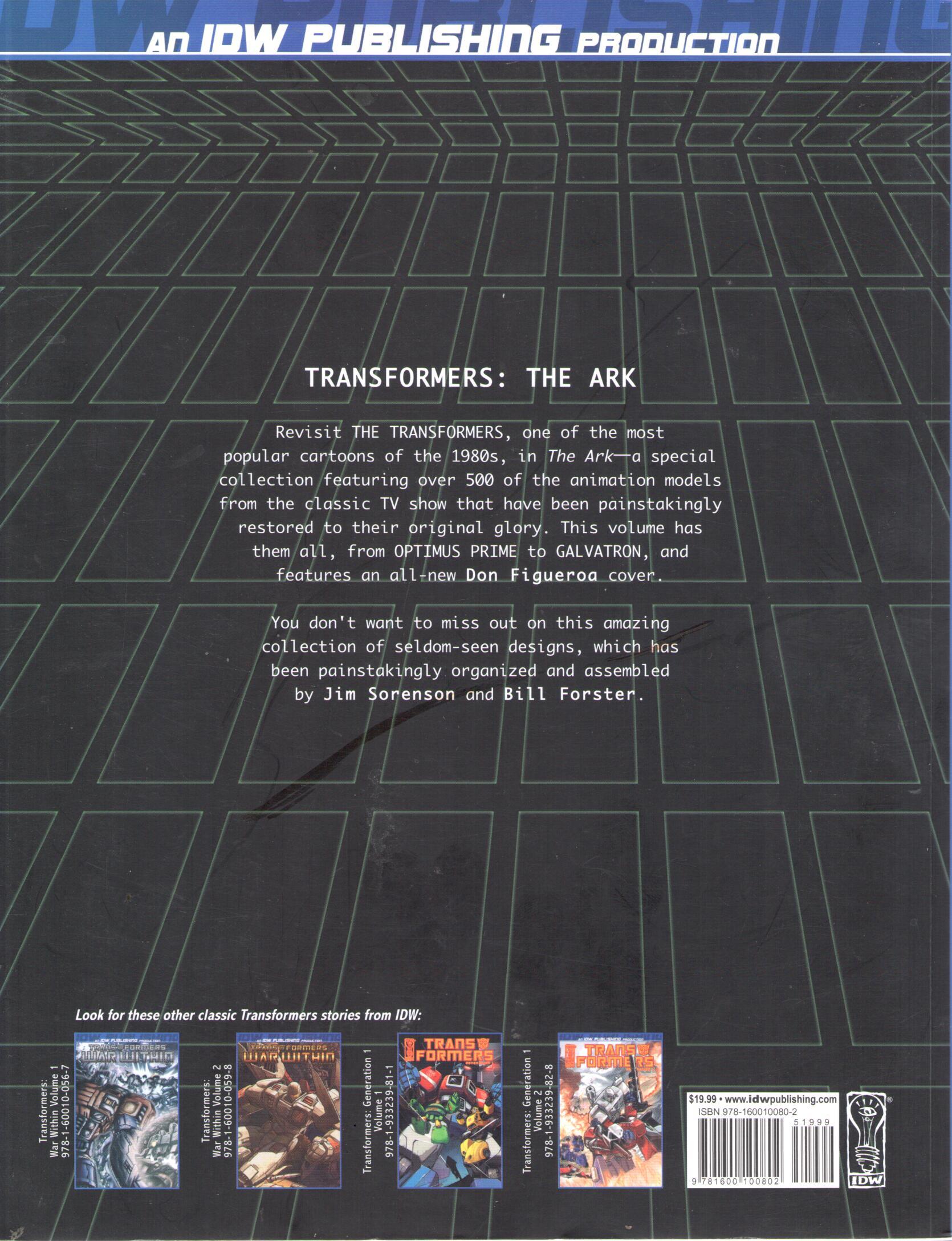 THE TRANSFORMERS, one of the most popular cartoons of the 1980s, in "The Ark"! "The Ark" collects over 500 of the animation models from the classic TV show that have been painstakingly restored to their original glory. This volume has them all, from Optimus Prime to Galvatron, and features a brand new Don Figueroa cover. These designs are incredibly rare and are seldom seen outside of Japan. You won't want to miss out on this amazing collection!