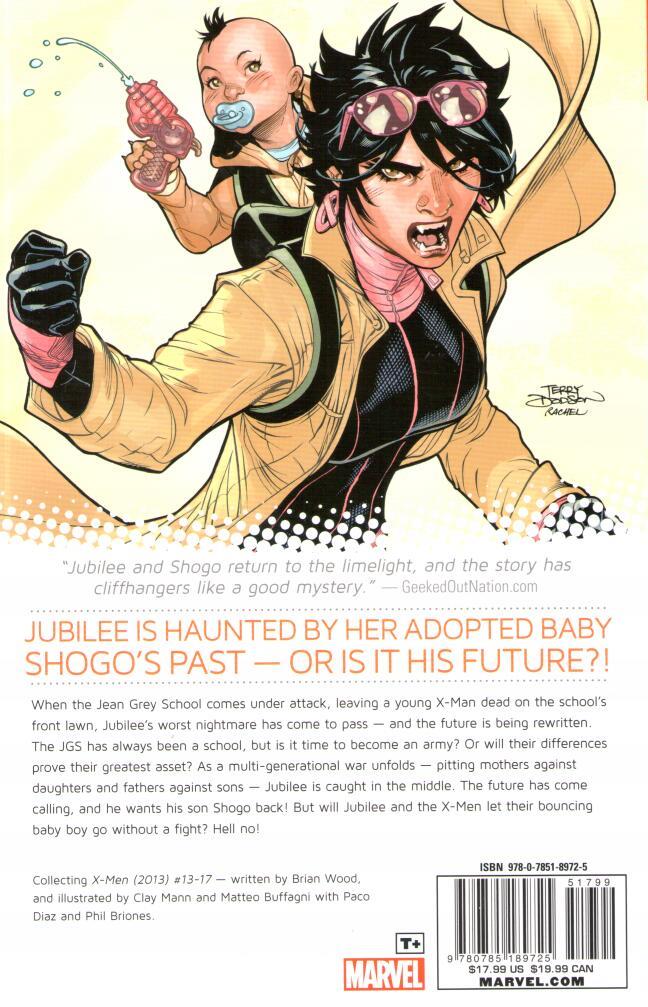 Jubilee is haunted by her adopted baby Shogo's past...or is it his future?! When the Jean Grey School comes under attack, leaving a young X-Man dead on the school's front lawn, Jubilee's worst nightmare has come to pass...and the future is being rewritten. The JGS has always been a school, but is it time to become an army? Or will their differences prove their greatest asset? As a multi -generational war unfolds, with mothers against daughters, fathers against sons, Jubilee is caught in the middle. The future has come calling, and he wants his son Shogo back! But will Jubilee and the X-Men let their bouncing baby boy go without a fight? Hell no!